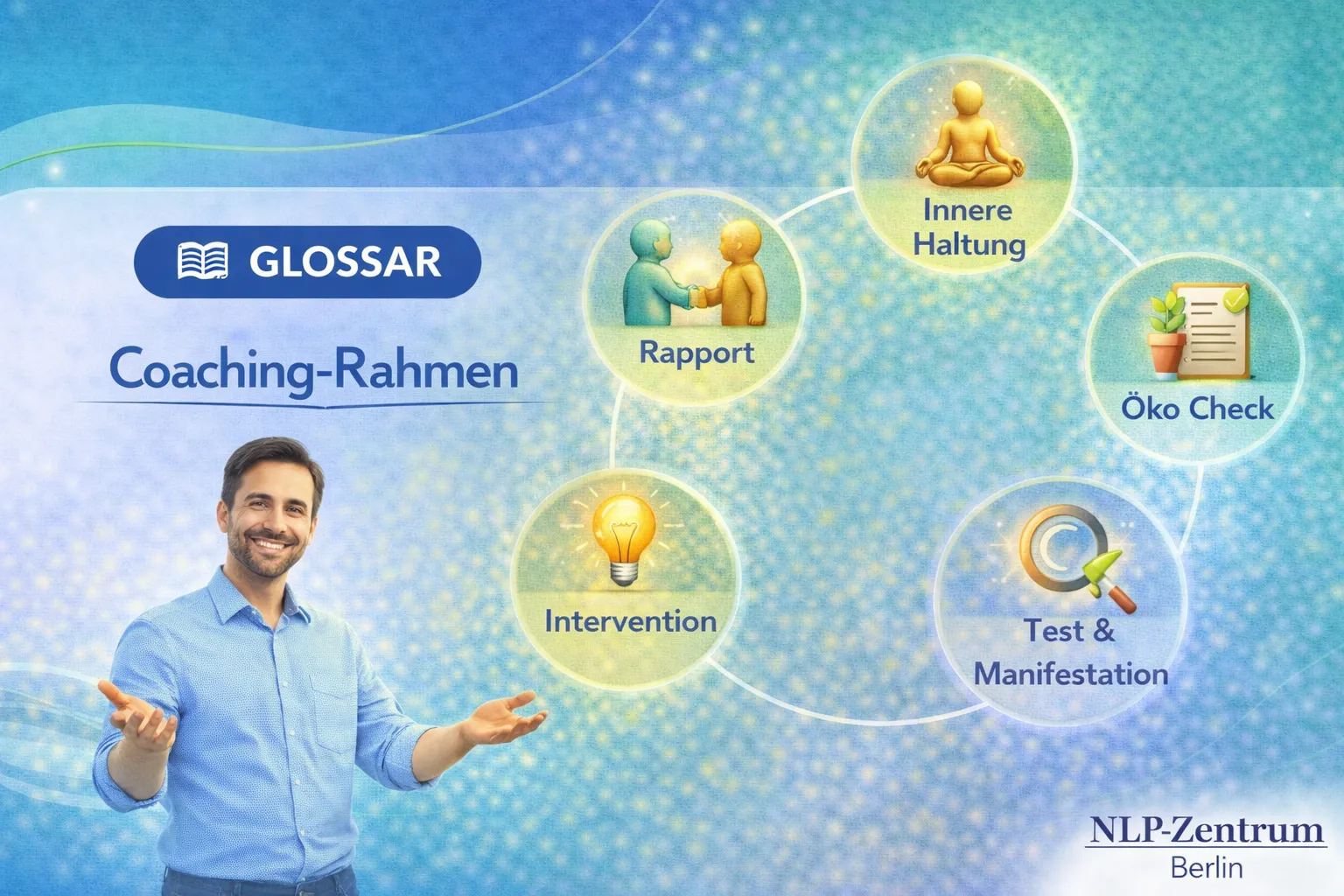 Der Coachingrahmen besteht aus den Bausteinen Rapport, Thema und Ziel, Öko Check, Intervention und Test & Manifestation.