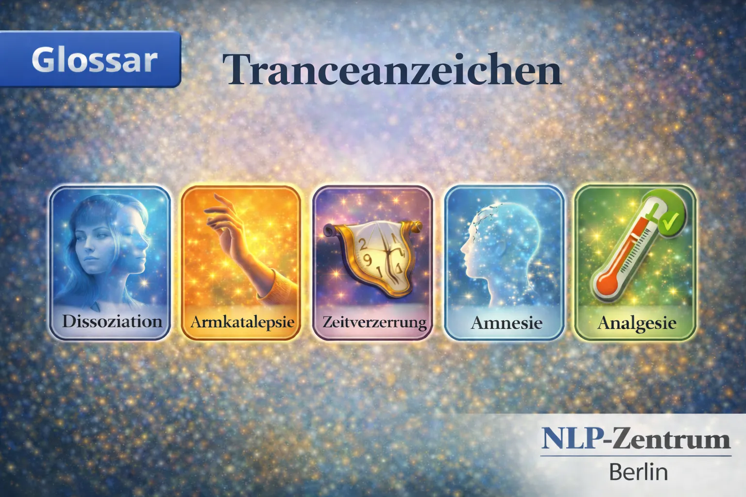 Tranceanzeichen sind beispielsweise Augenflattern, schnelle Augenbewegungen, die Veränderung der Gesichtsfarbe, das tiefer Werden der Stimme, die Glättung von Stirnfalten und eine Veränderung der Atmung. Diese körperlichen Anzeichen können den Coachee irritieren, vielleicht kann es ihm im ersten Augenblick auch unbekannt und unbehaglich vorkommen, daher sollten auftretende Tranceanzeichen in die Trance miteingebaut werden.